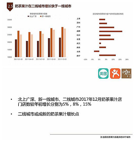 1)奶茶果汁店發(fā)展的情況,二線城市增長快于一線城市,或成為新的增長點(diǎn);