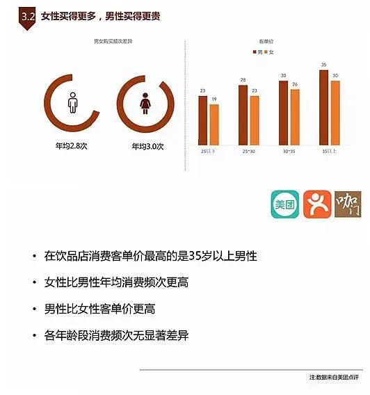 1)男性年均購買頻次大概2.8次,女性3.0次;
