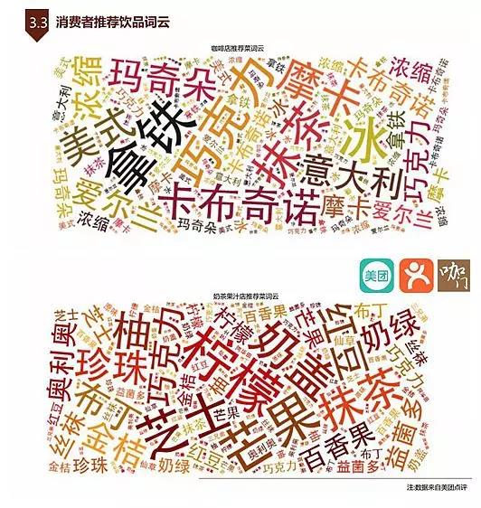 1)咖啡店推薦菜詞云中,拿鐵、摩卡、卡布奇諾等經(jīng)典款依舊備受寵愛;
