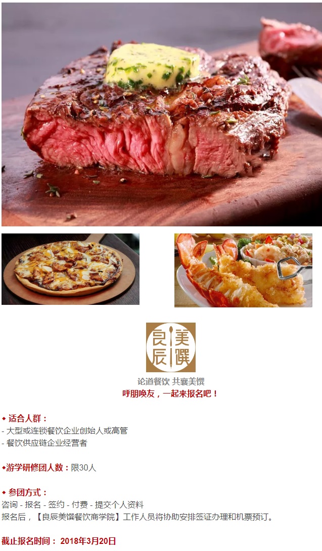 【良辰美饌餐飲商學(xué)院】重磅推出“中國餐飲精益管理美國精英研修團(tuán)”,將以上精彩一網(wǎng)打盡。現(xiàn)向餐飲業(yè)精英發(fā)出召集令------讓我們一同啟程探尋美國餐飲文化之風(fēng)采:展會調(diào)研、企業(yè)參訪、大咖交流、餐廳巡禮、跨界體驗、美食品鑒......