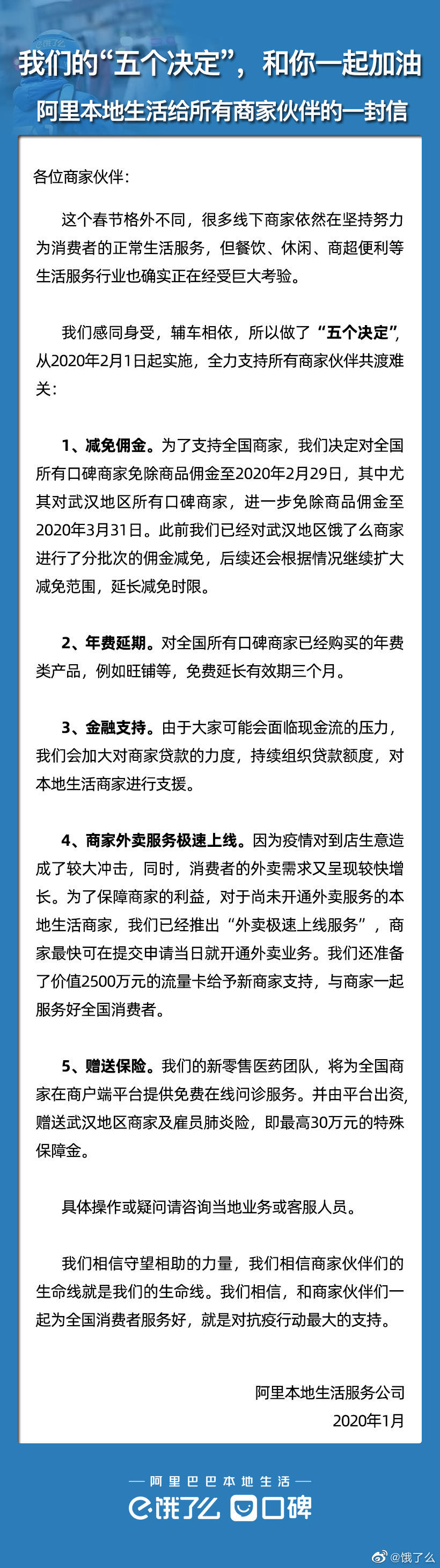 疫情牽動(dòng)著萬(wàn)千國(guó)人的心,也深刻影響著行業(yè)冷暖。1月30日,阿里本地生活服務(wù)公司率先對(duì)行業(yè)發(fā)出《給所有商家伙伴的一封信》(以下稱“《公開信》”),公布包括減免傭金、極速上線和金融支持在內(nèi)的“五個(gè)決定” ,全力支持所有商家伙伴,共渡難關(guān)。商戶反響熱烈,稱“五個(gè)決定”是本地生活服務(wù)行業(yè)的一場(chǎng)“及時(shí)雨”。