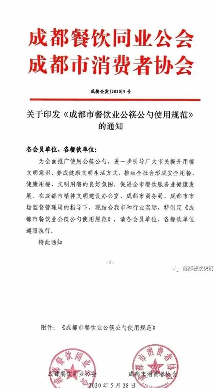 日前,成都餐飲同業(yè)公會(huì)、成都市消費(fèi)者協(xié)會(huì)聯(lián)合制定了《成都市餐飲業(yè)公筷公勺使用規(guī)范》,成都餐飲業(yè)公筷公勺使用規(guī)范適用于成都各種經(jīng)濟(jì)類型的餐飲服務(wù)單位,包括飯莊、酒家、酒樓、餐館、餐廳、火鍋店、小吃店、快餐店、面館,以及集體用餐配送企業(yè)。