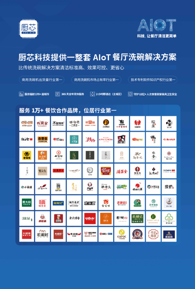 據(jù)悉,廚芯科技AIoT餐廳洗碗解決方案從“聯(lián)網(wǎng)智能洗碗機(jī)+高倍凈力小桶上墻清洗劑+即速響應(yīng)服務(wù)+數(shù)據(jù)化管理工具”全面解決餐廳洗碗難題,高壓去漬、立體沖洗、智溫消毒、全維催干的整個(gè)洗碗過程控制在60秒以內(nèi),批量清洗,高度節(jié)省人工。配以自主研發(fā)的餐具清洗劑,上墻技術(shù)更加節(jié)省空間。