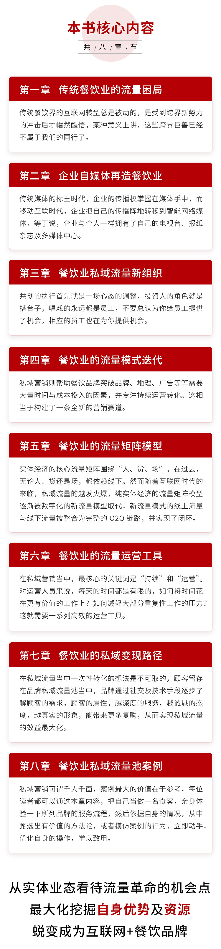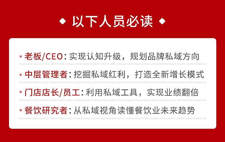 主要圍繞餐飲業(yè)面對流量貴、流量少、流量假的困局,如何破局,這個角度出發(fā),看懂流量困局折射出餐飲人對互聯(lián)網(wǎng)認知斷層的這樣一種現(xiàn)實存在,所以,編寫了行業(yè)第一本系統(tǒng)描述餐飲業(yè)如何搭建私域流量的工具書,但不僅是工具。