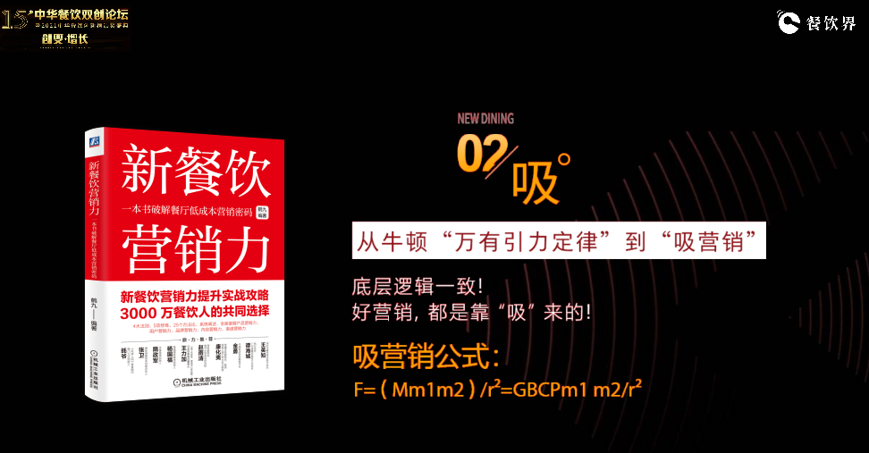 我在我的新書《新餐飲營銷力》里首次提出了“吸營銷”理論。這里邊的“吸”,跟牛頓萬有引力定律里描述的”任何物體之間都有互相吸引力”原理幾乎相通。我們?cè)O(shè)想一下:牛頓萬有引力公司是F=GM1M2/r2,這里的M1M2分別是兩個(gè)物體的質(zhì)量,r是兩個(gè)物體之間的距離,質(zhì)量越大、距離越短,兩個(gè)物體之間的吸引力就越強(qiáng)。而在商業(yè)環(huán)境中,M1代表營銷主題的“產(chǎn)品力”,M2應(yīng)當(dāng)是目標(biāo)用戶對(duì)產(chǎn)品的“需求力”,r應(yīng)當(dāng)是營銷信息與目標(biāo)用戶之間的傳播路徑。