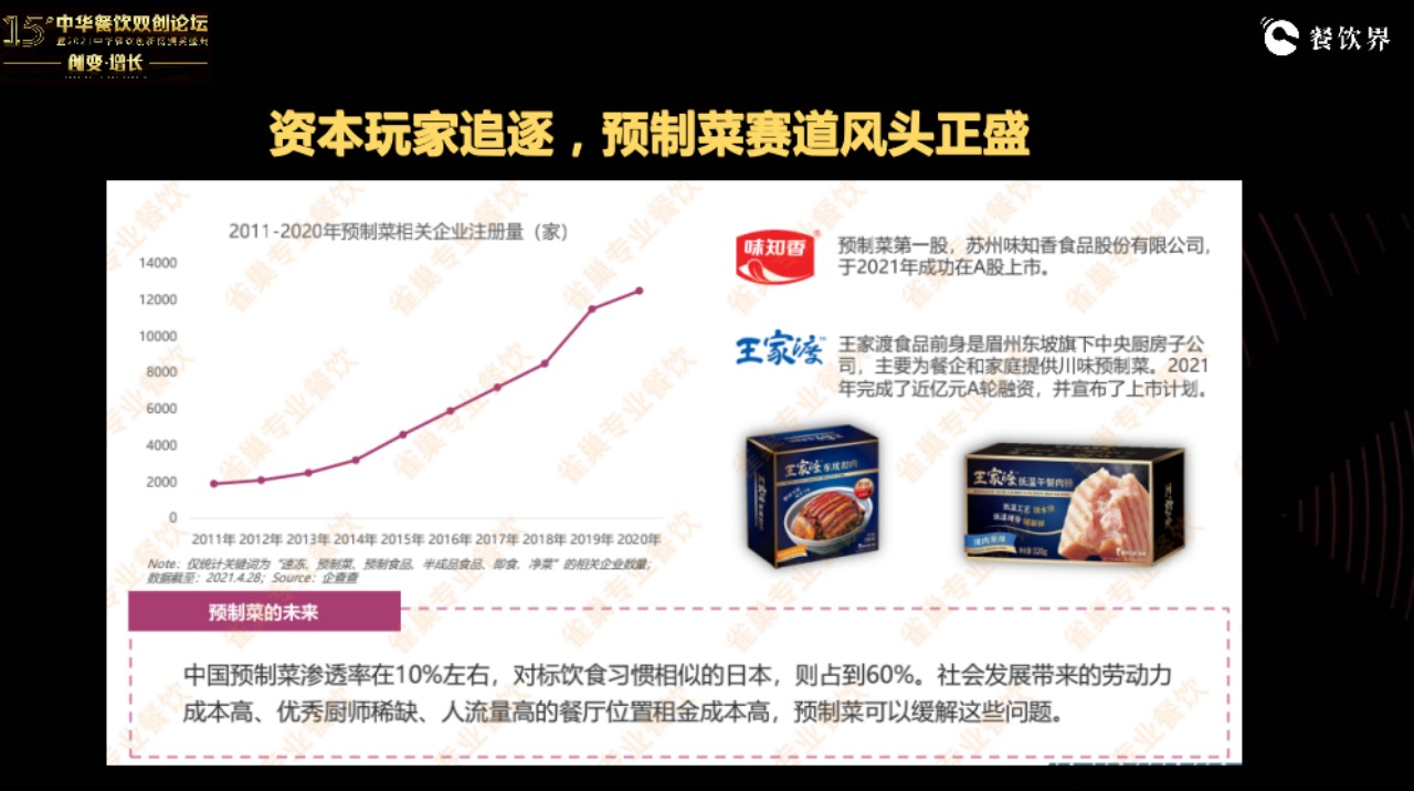 我們通過企查查數(shù)據(jù)統(tǒng)計(jì),2011-2020年,預(yù)制菜相關(guān)企業(yè)注冊(cè)數(shù)量,從2000家增加到12000多家。在2021年,我們看到中國預(yù)制菜第一股味知香在國內(nèi)A股上市,估值超100億。