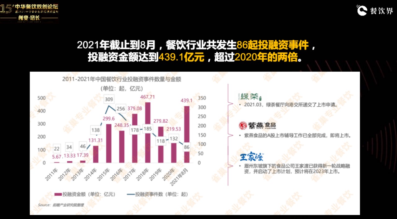 在大消費(fèi)賽道備受資本青睞的大背景下,餐飲也成為了“香餑餑”。據(jù)前瞻數(shù)據(jù)統(tǒng)計(jì),2021年截止到8月,餐飲行業(yè)共發(fā)生86起投融資事件,投融資金額達(dá)到439.1億元,超過2020年的兩倍。
