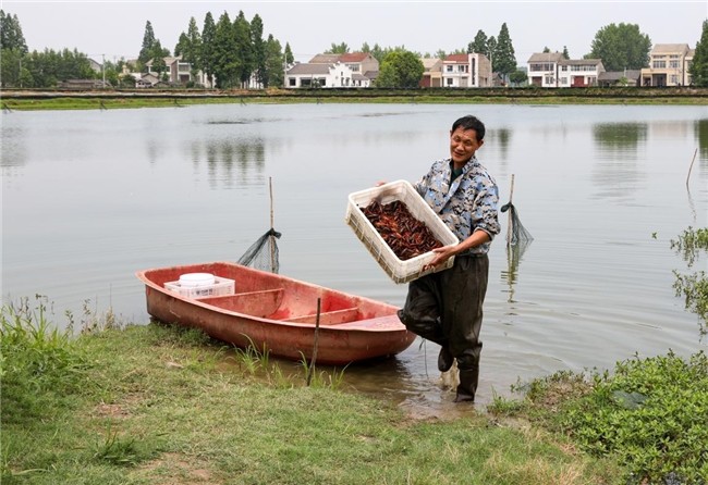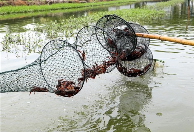 在位于潛江市秀河村的新柳伍萬畝蝦稻共作基地,養(yǎng)殖池里棋盤式分布著捕蝦網,岸邊整齊碼放著專用于小龍蝦養(yǎng)殖的燈籠草和扁擔草。養(yǎng)殖池蝦稻共作、水草喂養(yǎng),這是潛江小龍蝦營養(yǎng)豐富、肉質鮮嫩且綠色環(huán)保的獨家“秘訣”。