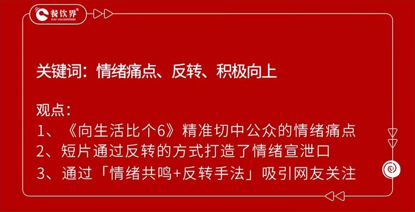 內(nèi)容決定了短片的“起點”,傳播則決定了短片的“終點”,如何傳播也決定著公益短片營銷的成敗。在餐飲界(canyinj.com)看來,《向生活比個6》在傳播中有兩大動作值得借鑒。