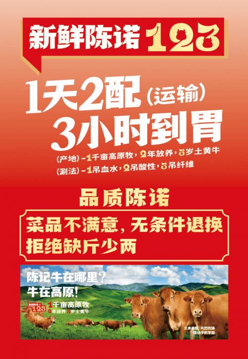 品牌要跑得快,后端供應(yīng)鏈必須跟得上。陳記順和成熟的供應(yīng)鏈體系和標(biāo)準(zhǔn)化管理,從活牛運(yùn)輸?shù)酵涝椎脚渌偷讲妥佬纬砷]環(huán)。每天 2-3 次的新鮮配送,牛肉 3 小時(shí)送達(dá)餐桌,不僅保留了肉質(zhì)的鮮美,讓顧客能夠享受更新鮮的食材體驗(yàn),同時(shí)也讓品牌擁有議價(jià)的主動(dòng)權(quán),建立自己的護(hù)城河。