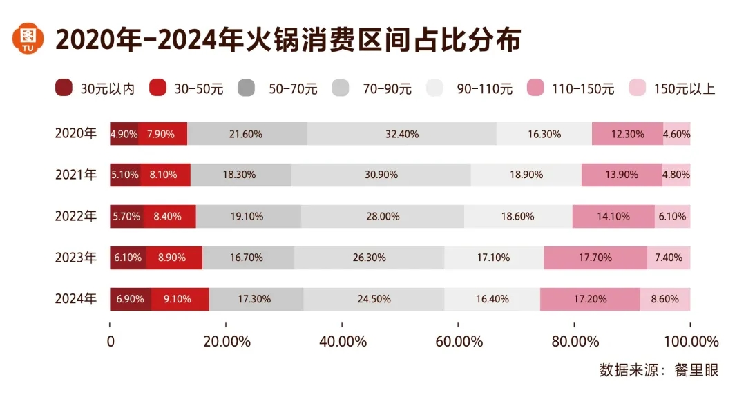 如下圖所示,火鍋消費(fèi)價(jià)格區(qū)間呈現(xiàn)兩極增長、中間收縮的勢(shì)態(tài)。由2020年到2024年的數(shù)據(jù)變化來看,50元以下價(jià)格帶占比增長了2.4%,110元以上價(jià)格帶占比增長了8.9%。