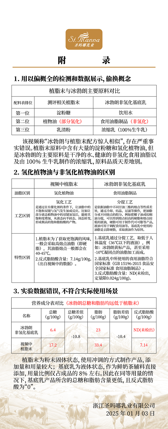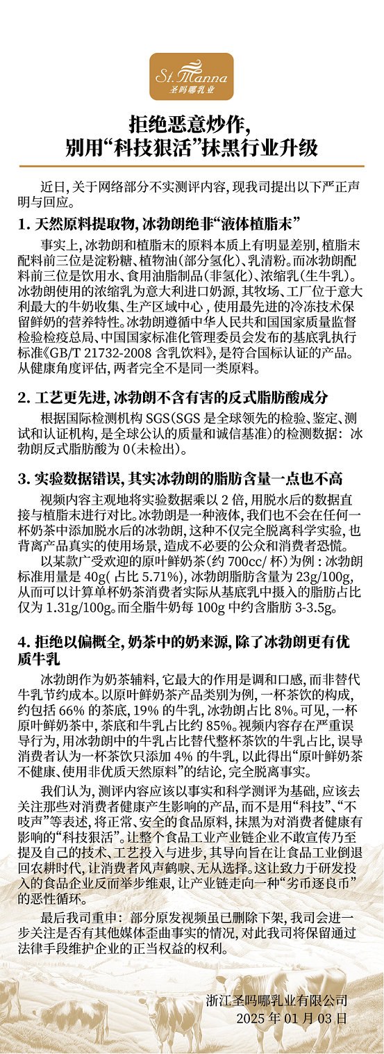 圣嗎哪回應,根據(jù)國際檢測機構(gòu)SGS的數(shù)據(jù),就原料本質(zhì)與健康影響而言,冰勃朗與植脂末是兩種完全不同的食品原料,評測視頻以偏概全,采用錯誤的實驗數(shù)據(jù),而非實際使用場景來對飲品的工藝定性,存在對消費者的巨大誤導。