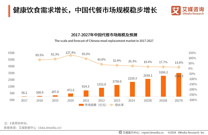 iiMedia Research(艾媒咨詢(xún))數(shù)據(jù)顯示,2017-2023年中國(guó)代餐市場(chǎng)規(guī)模持續(xù)增長(zhǎng),2023年已達(dá)1750.0億元。這一趨勢(shì)表明,消費(fèi)者對(duì)于健康食品的認(rèn)知度正在不斷提高,健康需求也在逐漸細(xì)化。預(yù)計(jì)到2027年,中國(guó)代餐市場(chǎng)規(guī)模有望達(dá)到3534.9億元。在這樣的市場(chǎng)環(huán)境下,食品企業(yè)紛紛推出有機(jī)食品、無(wú)添加劑食品、低脂代餐食品等,以爭(zhēng)奪日益擴(kuò)大的市場(chǎng)份額。