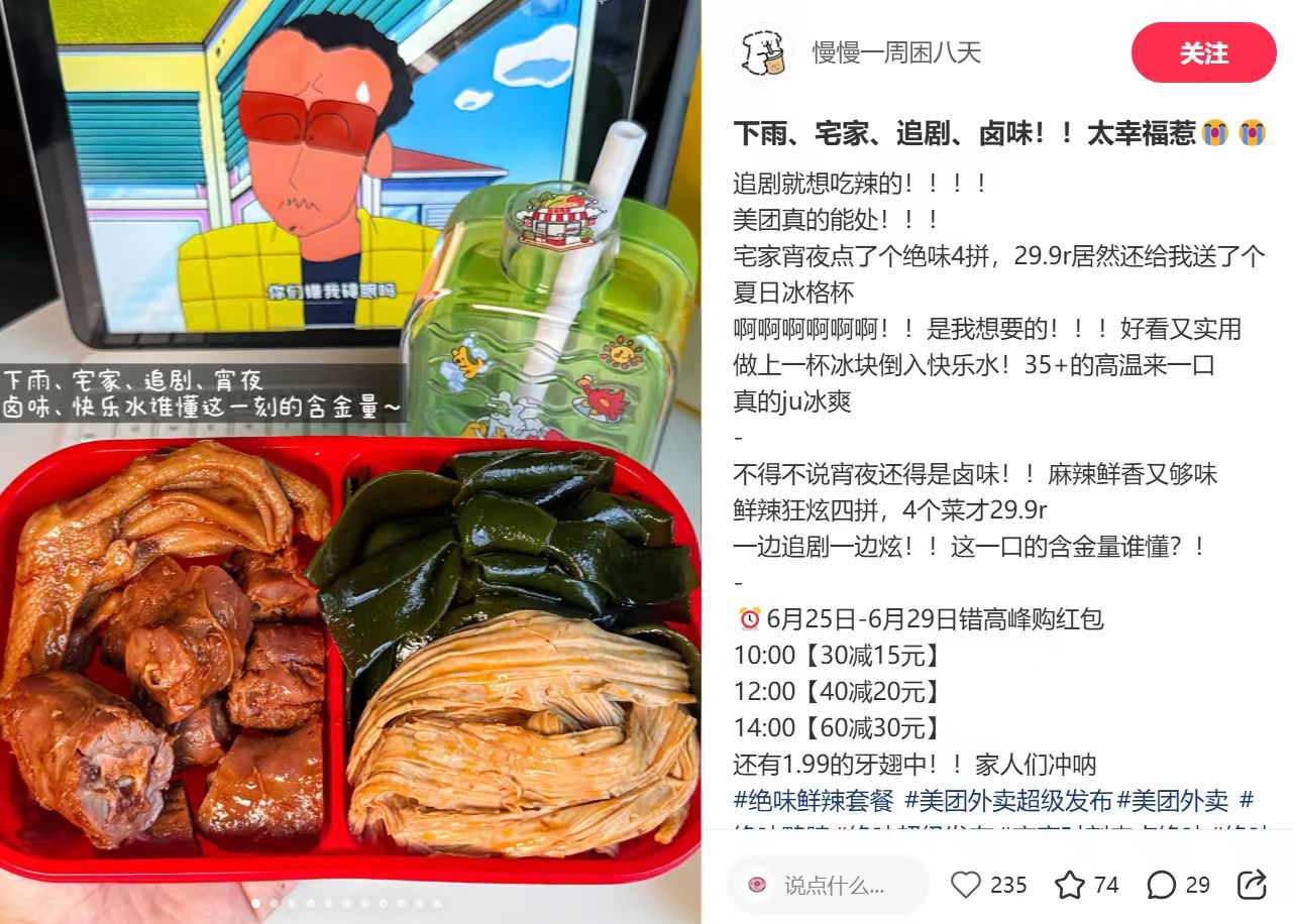 本次活動實現(xiàn)全網(wǎng)曝光5億+,小紅書話題總瀏覽1600萬+,總互動2.1萬+。這些亮眼的數(shù)據(jù)背后,是絕味鴨脖與美團外賣對年輕消費群體社交習慣與內容偏好的精準把握,除了在美團平臺上的精準曝光,在達人種草策略上亦是可圈可點。