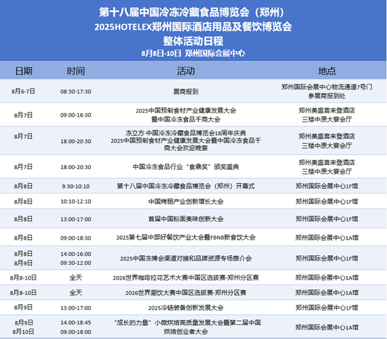 2025年88日至10日,2025HOTELEX鄭州國(guó)際酒店用品及餐飲博覽會(huì)和第十八屆中國(guó)冷凍冷藏食品博覽會(huì)(鄭州)將在鄭州國(guó)際會(huì)展中心盛大開(kāi)幕。