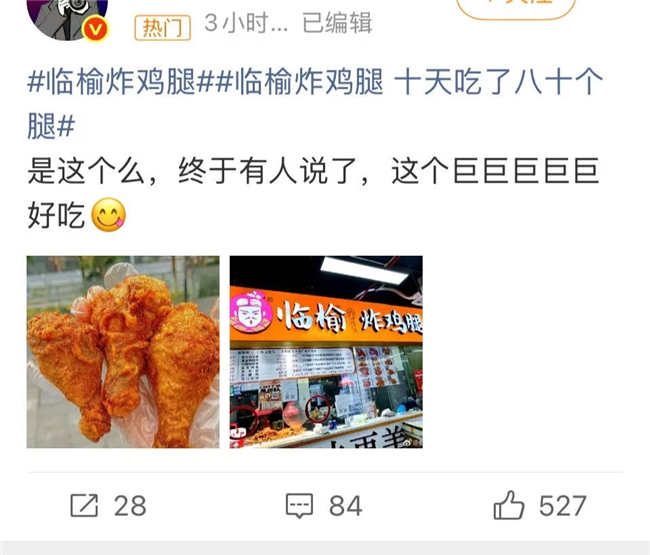 1月18日,中式炸雞品牌臨榆炸雞腿突然在社交媒體平臺(tái)引發(fā)網(wǎng)友熱烈討論,連續(xù)三個(gè)話題登上微博熱搜并引發(fā)“臨榆炸雞腿 十天吃了八十個(gè)腿”等多個(gè)衍生話題,相關(guān)閱讀量超一億。談及喜歡臨榆炸雞腿的原因,網(wǎng)友多數(shù)表示被鮮嫩多汁的口感吸引,且口味與韓式、美式炸雞均有不同,更有網(wǎng)友表示“十天吃了八十個(gè)雞腿”,還有不少網(wǎng)友表示“吃了多年的寶藏品牌終于火了”。