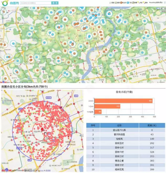 如下圖所示:直接在商圈秀智能平臺上輸入地址,便可得知競爭店鋪分布數(shù)量、消費者特征等有助選址的關(guān)鍵信息。
