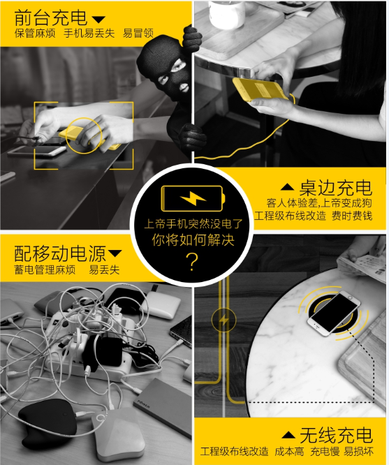 餐廳為滿足消費(fèi)者的充電需求,在前臺(tái)設(shè)置排插、插座等,讓消費(fèi)者自行充電。但是前臺(tái)充電,一來影響美觀,插線遍布不僅凌亂還有安全隱患;二來顧客必須離開自己的手機(jī)到座位上用餐,這便極大地降低了顧客的用餐情緒和體驗(yàn)。再者,餐廳代為保管顧客手機(jī),萬一出現(xiàn)丟失的情況,更影響餐廳聲譽(yù)。