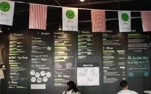 Shake Shack不管從餐廳氛圍和產品印象上都屬于“高大上”的范疇。創(chuàng)始人請來了全球頂級設計師 Paula Scher設計裝潢和圖標。綠色和白色營造出休閑清新的氛圍,將近60%的露天座位、遠遠看去就是一家高端餐廳,誰也不會想到這是一家快餐店。