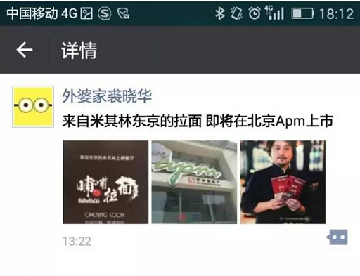 520這天中午,外婆家總裁裘曉華在微信朋友圈說:“來自米其林東京的拉面,即將在北京APM上市?!?/span>