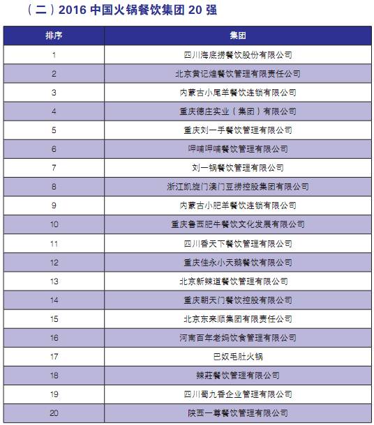 火鍋餐飲50強營業(yè)額合計超過450億元,四川海底撈餐飲股份有限公司成為領(lǐng)軍企業(yè),北京黃記煌餐飲管理有限責(zé)任公司、內(nèi)蒙古小尾羊餐飲連鎖有限公司進入前三甲;