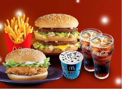 麥當勞柜臺上方醒目的地方是幾款套餐的大幅圖片,一份巨無霸加一份薯條與一杯可樂就配成巨無霸套餐。