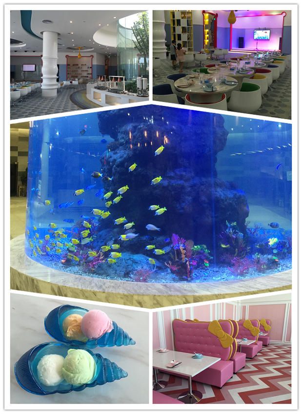 餐廳專門打造了夢(mèng)幻十足的Hello Kitty區(qū)。粉色不僅是凱蒂貓最愛的顏色,也是最能彰顯小公主們氣質(zhì)的顏色。粉色控的小女孩們可以在這里和Hello Kitty一起度過(guò)美妙的時(shí)光。而在餐廳中央大廳處,設(shè)置了多個(gè)圓柱形的海洋動(dòng)植物玻璃缸,各種叫不出名字的奇妙魚類在其中暢游嬉戲,仿佛置身于水族館一般。餐廳墻面上,則繪制有多啦a夢(mèng)、大頭兒子小頭爸爸等眾多深入人心的卡通形象。