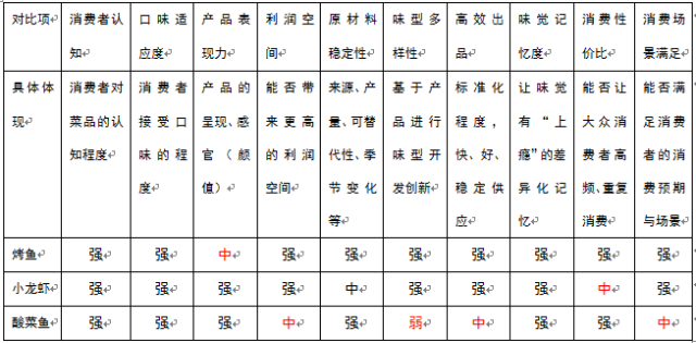 2、烤魚、小龍蝦、酸菜魚三者的橫向對比(強/中/弱)