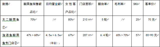 (注1:①②數(shù)據(jù)來源于品牌方;注2:漁語魚門店數(shù)據(jù),“﹥”符號連接的是變革前后的數(shù)據(jù),如“4.5萬﹥6.5萬”指轉型為酸菜魚專門店后,日均營業(yè)額由4.5萬提升至6.5萬)