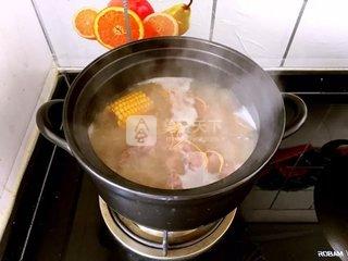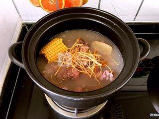 5、放入玉米段,再用旺火燒沸20分鐘。最后倒入鮮蟲草花,再續(xù)煮15分鐘。