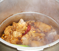 6、將煮過的豬腳撈出,用涼水沖洗至涼,放入高壓鍋中。再將泡好的黃豆撈出,沖洗干凈后也放入高壓鍋中。再放入蔥、姜、干紅椒、山楂,加入適量水,水量約沒過食材底部即可。點火,大火煮開。