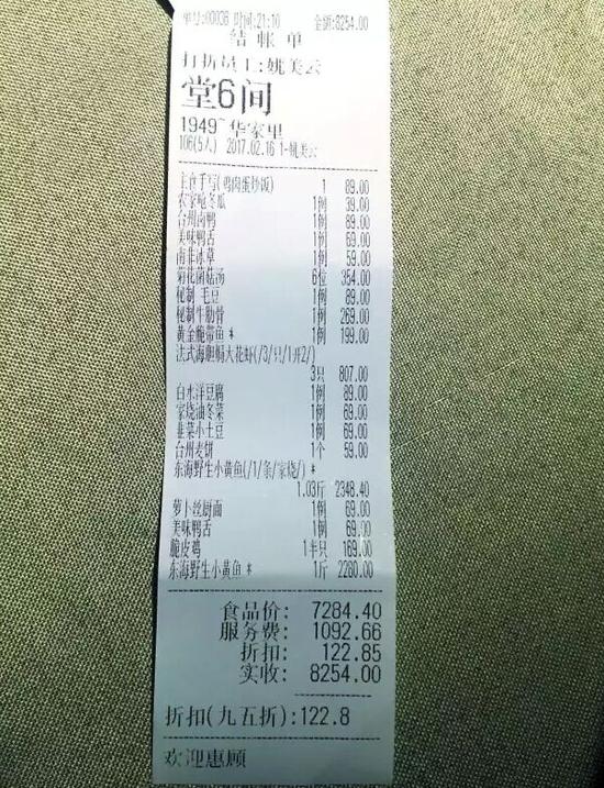 根據(jù)餐廳提供的消費(fèi)清單顯示,當(dāng)晚李先生總共消費(fèi)了8254元,其中包含兩條重量為1.03斤和1斤的東海野生小黃魚,兩條魚價(jià)格一共4628元。在消費(fèi)清單中,還包含一項(xiàng)1092.66元的服務(wù)費(fèi),李先生認(rèn)為這一服務(wù)費(fèi)價(jià)格過高。