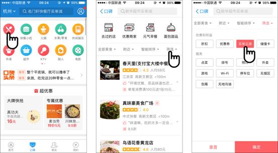 為了讓消費(fèi)者更快找到參與立減的商家,支付寶口碑頻道特地上線了商店篩選功能。用戶選擇買單立減功能,口碑系統(tǒng)會(huì)根據(jù)用戶所在的地理位置,推薦具有此項(xiàng)優(yōu)惠的線下商家。