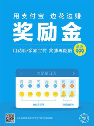 今年3月起,支付寶用戶每天在貼有獎(jiǎng)勵(lì)金海報(bào)的支付寶商家處,首次消費(fèi)超過2元,就能獲得1筆獎(jiǎng)勵(lì)金。使用支付寶花唄、余額寶支付,獲得的獎(jiǎng)勵(lì)金有一次翻倍機(jī)會(huì),翻倍后最高可獲得999元。周日到周四累積的金額,周五周六消費(fèi)時(shí)直接抵扣。除此之外,每周二使用花唄、余額寶在線下買單,還能獲得8折(5元封頂)的優(yōu)惠。