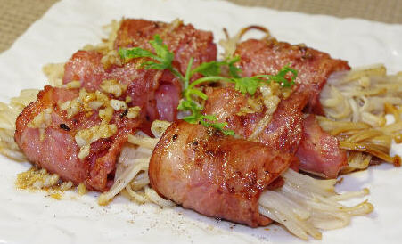 培根肉,又叫煙熏肉、煙肉,是將未經(jīng)腌熏等加工的豬胸肉,或其他部位的豬肉熏制而成。培根系由英語“Bacon”譯音而來,其原意是煙熏肋條肉(即方肉)或煙熏咸背脊肉。培根是西式肉制品三大主要品種(火腿、灌腸、培根)之一,其風味除帶有適口的咸味之外,還具有濃郁的煙熏香味。培根外皮油潤呈金黃色,皮質(zhì)堅硬,用手指彈擊有輕度的“卟卟”聲;瘦肉呈深棕色,質(zhì)地干硬,切開后肉色鮮艷。煙肉主要出產(chǎn)地在北美洲,英國和愛爾蘭。