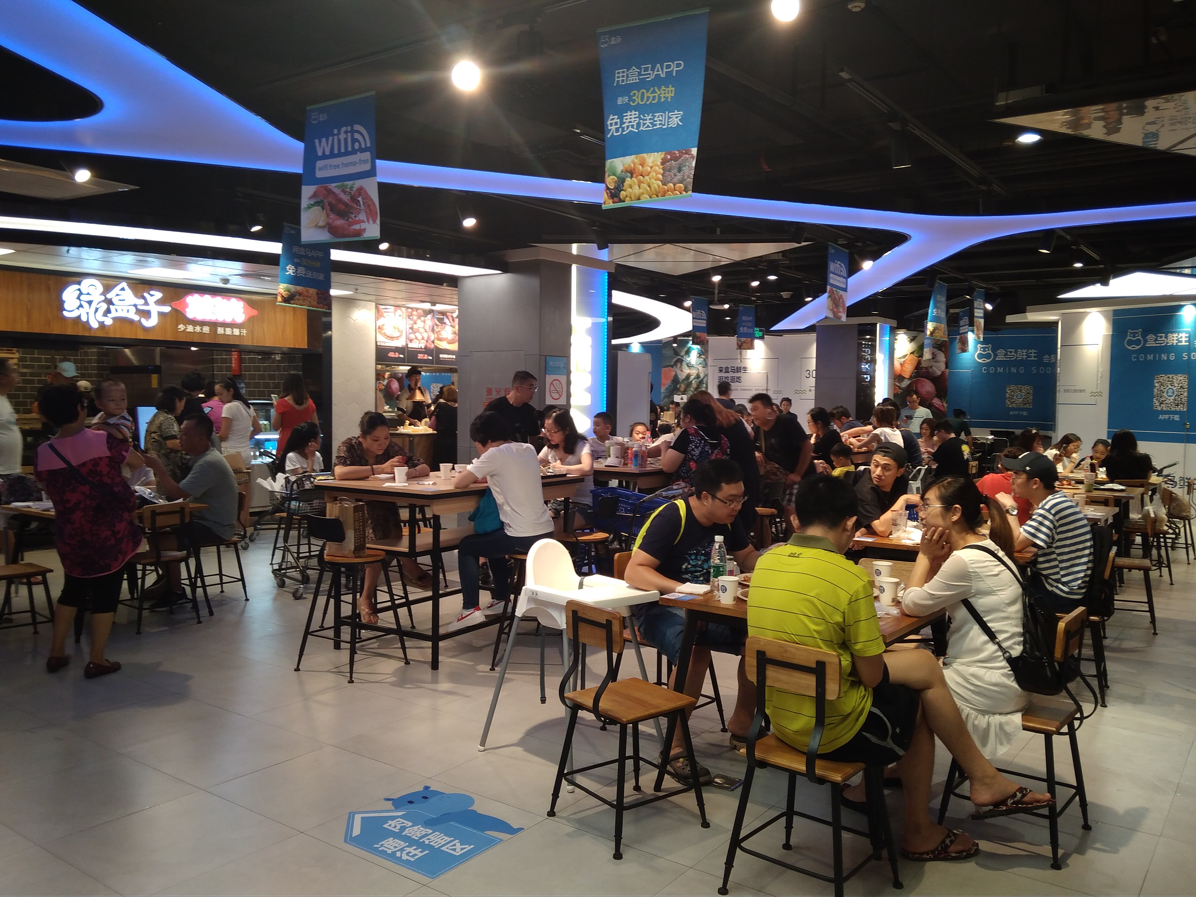 傳統(tǒng)超市里,人們只能挑、選、逛,在盒馬鮮生,人們可挑、選、逛、吃。